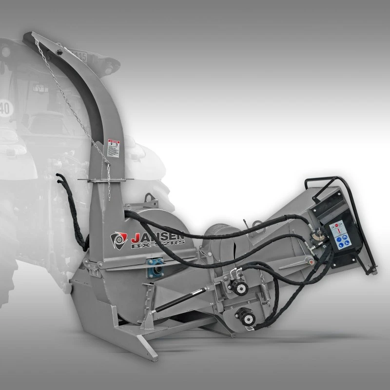 Midden September weer leverbaar!De Jansen BX-92RS is de grote broer van de BX-62RS. Door zijn hydraulische aanvoer is het werken met deze machine een ware vreugde. Aanschuiven, drukken enz. hoeft bij dit model niet; dit wordt door 2 grote invoerrollen gedaan. De snelheid van de invoerrollen kan traploos gevarieerd worden. Dit is belangrijk voor het aanpassen van de invoersnelheid op de diameter van het hakselmateriaal. Kleinere diameters kunnen sneller door de machine gehaald worden dan grotere diameters. Mocht het hakselmateriaal toch blokkeren, kan door middel van de grote beugel aan de trechter de doorgang ook in een achteruitgang gezet worden. Verder kan de doorloop van het te hakselen goed ook door middel van de beugel gestopt worden. De verzorging loopt via de tractorhydrauliek; hiervoor is een hydraulische druk aanvoer nodig en een drukloze terugloop of een dubbel werkend hydraulisch ventiel.De hakselaar wordt met aftakas geleverd. In de aftakas is aan één kant een breekpen ingebouwd, die om veiligheidsredenen als breekpunt bij blokkeringen en overbelasting dient. Hierdoor kunnen ook probleemloos tractoren met meer dan 100 PK gebruikt worden. Het voertuig dient minstens 50 PK te hebben. De aandrijfassnelheid moet minstens 540 omw/min bedragen.De trechter heeft boven een opening van 63,5 x 63,5 cm; de onderkant heeft een grootte van 25,5 x 38 cm. Vers hout kan tot een maximale diameter van 25,5 cm versnipperd worden. Veel concurrenten geven als maximale diameter de maten van de onderkant van de trechter aan, deze zijn echter niet realistisch en kunnen het veiligheidsmechanisme in de aftakas activeren. Zachtere houtsoorten kunnen tot een breedte van 38 cm versnipperd worden; echter worden stronken met deze diameter eerder als brandhout gebruikt dan dat ze worden versnipperd.De verwerking van de BX-92RS is erg solide; de materiaalsterktes van het gebruikte plaatmateriaal zijn bij de dragende delen 10 en 12 mm, aan de trechter en niet dragende delen 4 en 6 mm. Aarzel niet om deze gegevens met die van concurrenten te vergelijken, want hier wordt vaak gespaard!Voor het vervoer van de shredder kan de trechter eenvoudig omhoog geklapt worden en door middel van een borgpen vastgezet worden. Om het omhoog klappen te vereenvoudigen bezit de shredder 2 schokdempers.De machine is erg onderhoudsvriendelijk opgebouwd; zo kan men door middel van het losdraaien van slechts één schroef de complete vliegwielafdekking openen en heeft daardoor toegang tot de 4 messen. Deze messen zijn dubbelzijdig geslepen waardoor deze bij slijtage gewoon omgedraaid kunnen worden. Het vliegwiel heeft een gewicht van 125 kg en heeft aangebrachte schoepen die de sterke zuigkracht opwekken waardoor het hakselmateriaal uiteindelijk door de uitwerptrechter naar buiten geblazen wordt. Door deze zeer sterke luchtstroom is het verstopt raken van deze shredder nagenoeg uitgesloten.De uitwerptrechter heeft een hoogte van 220 cm (plus de verhoging van het onderstel) en kan 360 graden gedraaid worden. Wij kunnen naar wens ook nog een verlengstuk van 50 cm voor de uitwerptrechter leveren. Daarmee kunnen tractor aanhangers en big bags ook eenvoudig gevuld worden. De uitwerphoek kan ook veranderd worden. De BX-92RS werpt het hakselmateriaal tot wel 10 meter ver.De shredder is voor een driepuntsophanging ontworpen en kan vanaf cat. I gebruikt worden. Prijs in doos/ krat!Technische gegevens: Vermogen tractor: min. 50 PK Opname: driepuntsophanging vanaf cat. I Aftakas: bij levering inbegrepen Omw/min: 540 Aantal messen: 4 waarvan 1 contra-mes Diameter vliegwiel: 91,5 cm Aanvoer: hydraulisch (via tractorhydrauliek)